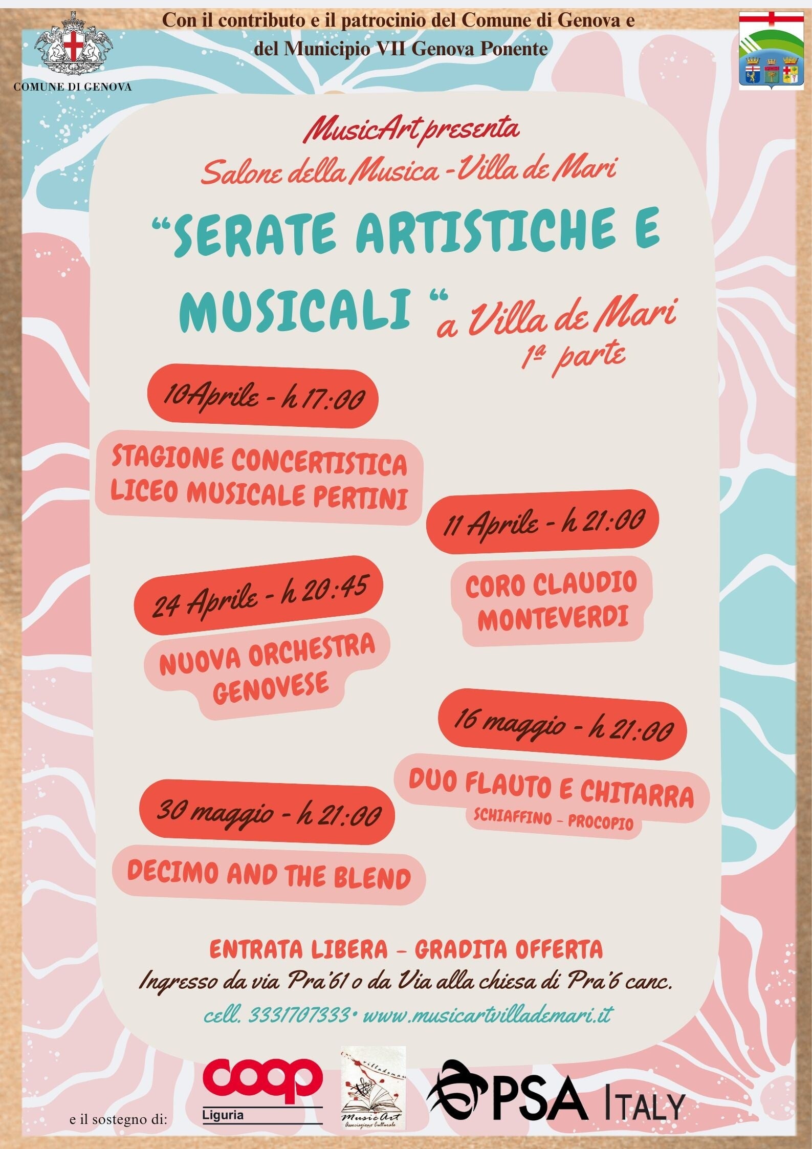 Qui potrai trovare tutte le informazioni sui prossimi eventi musicali organizzati dall'Associazione MusicArt - VilladeMari a Genova. Scopri le date, i titoli, gli artisti e i brani o le opere eseguite nei nostri concerti musicali e opere artistiche.